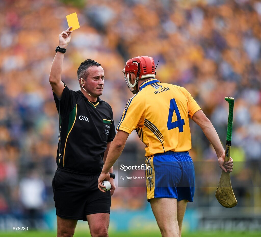 15 June 2014; Referee James McGrath issues a yellow card to Clare's Jack Browne late in the first half. Munster GAA Hurling Senior Championship, Semi-Final, Clare v Cork, Semple Stadium, Thurles, Co. Tipperary. Picture credit: Ray McManus / SPORTSFILE