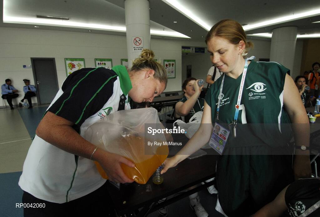 3 October 2007; Catherine Presch, Ballyboden, Dublin, right, with coach Louise O'Toole, during a break in divisioning in advance of the Basketball finals. 2007 Special Olympics World Summer Games, Shanghai Jiaotong University Gymnasium, Shanghai, China. Picture credit: Ray McManus / SPORTSFILE