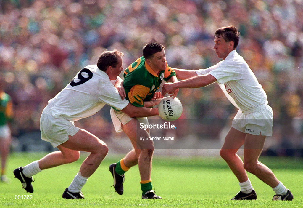 6 July 1997; Mark O'Reilly of Meath is tackled by Willie McCreerey, left, and Seamus Dowling of Kildare during the Leinster GAA Senior Football Championship Semi-Final match between Kildare and Meath at Croke Park in Dublin. Photo by Brendan Moran/Sportsfile