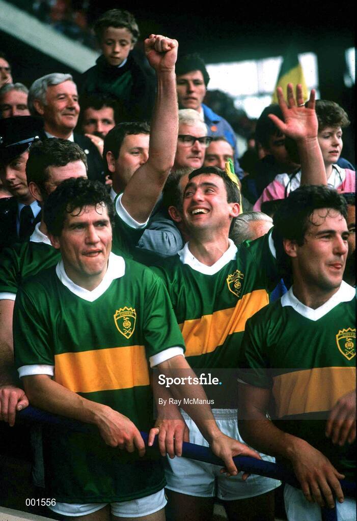 21 September 1986; Kerry's Ger Power, left, Denis Ogie Moran, centre, and Timmy Dowd celebrate Kerry's victory over Tyrone after the All-Ireland Football Final between Kerry and Tyrone in Croke Park, Dublin. Photo by Ray McManus/Sportsfile