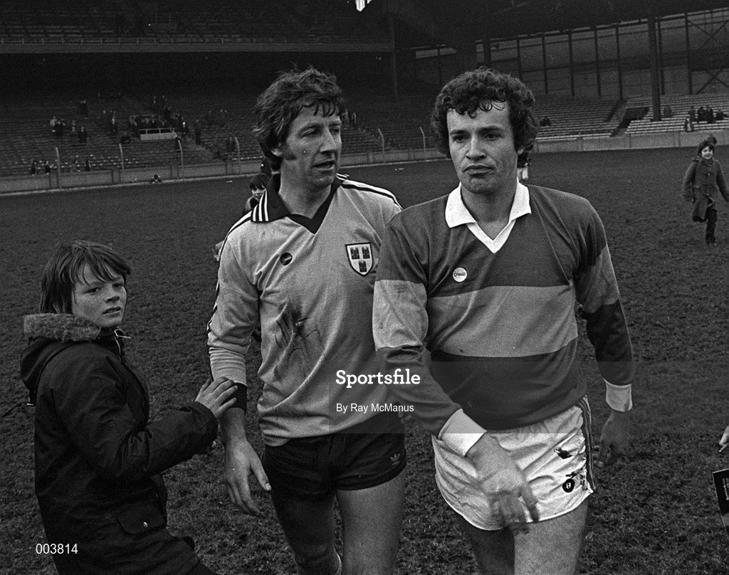 26 September 1976; Gay O'Driscoll of Dublin, centre, with, Mike Sheehy of Kerry following the GAA All-Ireland Football Championship Final match between Dublin and Kerry at Croke Park in Dublin. Photo by Ray McManus/Sportsfile