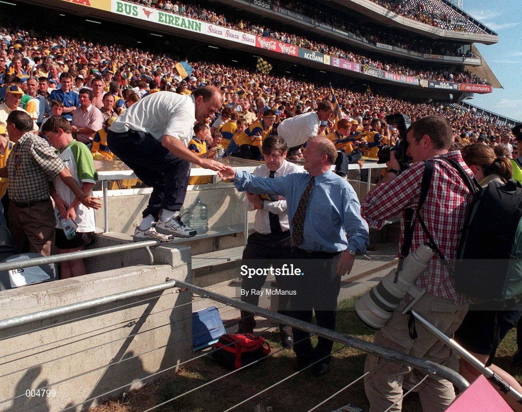 9 August 1998; Clare manager Ger Loughnane is helped back onto the pitch by Clare County Board chairman Robert Frost after the GAA Hurling All-Ireland Senior Championship Semi-Final match between Offaly and Clare at Croke Park in Dublin. Photo by Ray McManus/Sportsfile