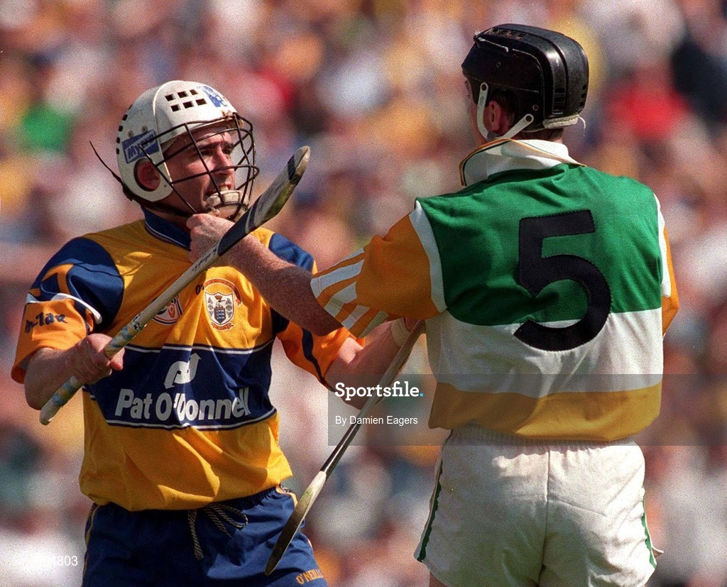 9 August 1998; Ger O'Loughlin of Clare and Brian Whelahan of Offaly involved in a tussle during the GAA Hurling All-Ireland Senior Championship Semi-Final match between Offaly and Clare at Croke Park in Dublin. Photo by Damien Eagers/Sportsfile