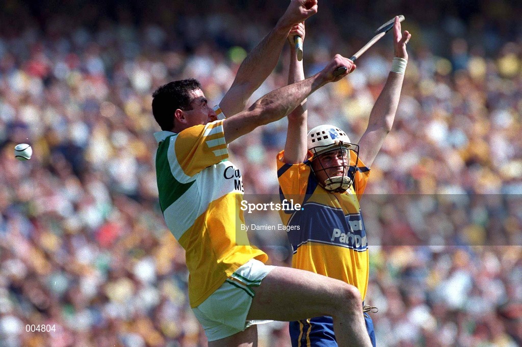 9 August 1998; Kevin Kinahan of Offaly in action against Ger O'Loughlin of Clare during the GAA Hurling All-Ireland Senior Championship Semi-Final match between Offaly and Clare at Croke Park in Dublin. Photo by Damien Eagers/Sportsfile