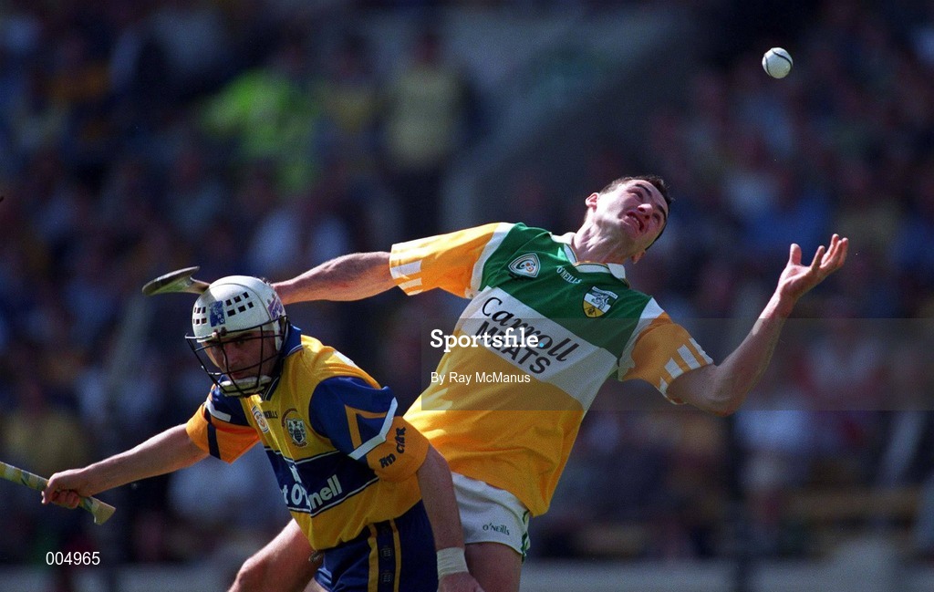 9 August 1998; Kevin Kinahan of Offaly in action against Ger O'Loughlin of Clare during the GAA Hurling All-Ireland Senior Championship Semi-Final match between Offaly and Clare at Croke Park in Dublin. Photo by Ray McManus/Sportsfile