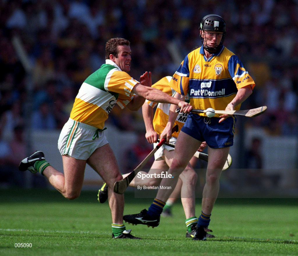 9 August 1998, Niall Gilligan of Clare in action against Kevin Martin of Offaly during the GAA Hurling All-Ireland Senior Championship Semi-Final match between Offaly and Clare at Croke Park in Dublin. Photo by Brendan Moran/SPORTSFILE