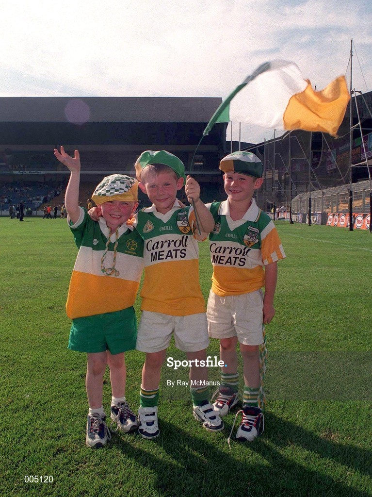 9 August 1998; Offaly supporters Darragh Cleary, left, age 4, with his cousins, Michael, centre, and Sean Cleary, who are twins, all from Shinrone, Co Offaly, after the GAA Hurling All-Ireland Senior Championship Semi-Final match between Offaly and Clare at Croke Park in Dublin. Photo by Ray McManus/Sportsfile