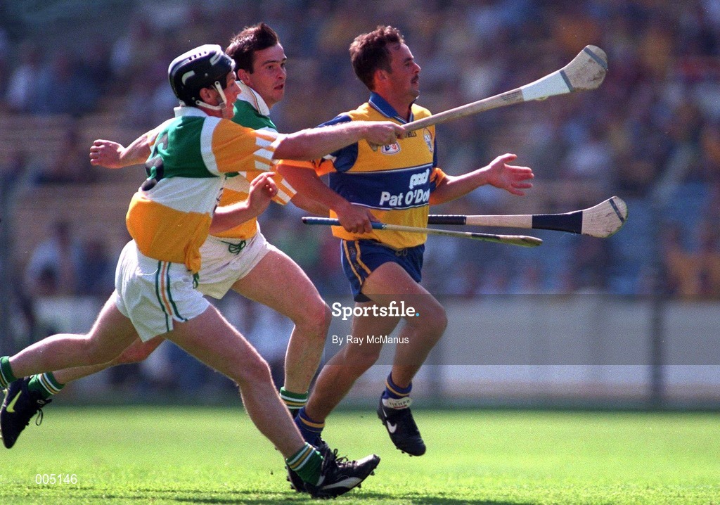9 August 1998, PJ O'Connell of Clare in action against Hubert rigney, left, and Johnny Pilkington of Offaly during the GAA Hurling All-Ireland Senior Championship Semi-Final match between Offaly and Clare at Croke Park in Dublin. Photo by Ray McManus/Sportsfile
