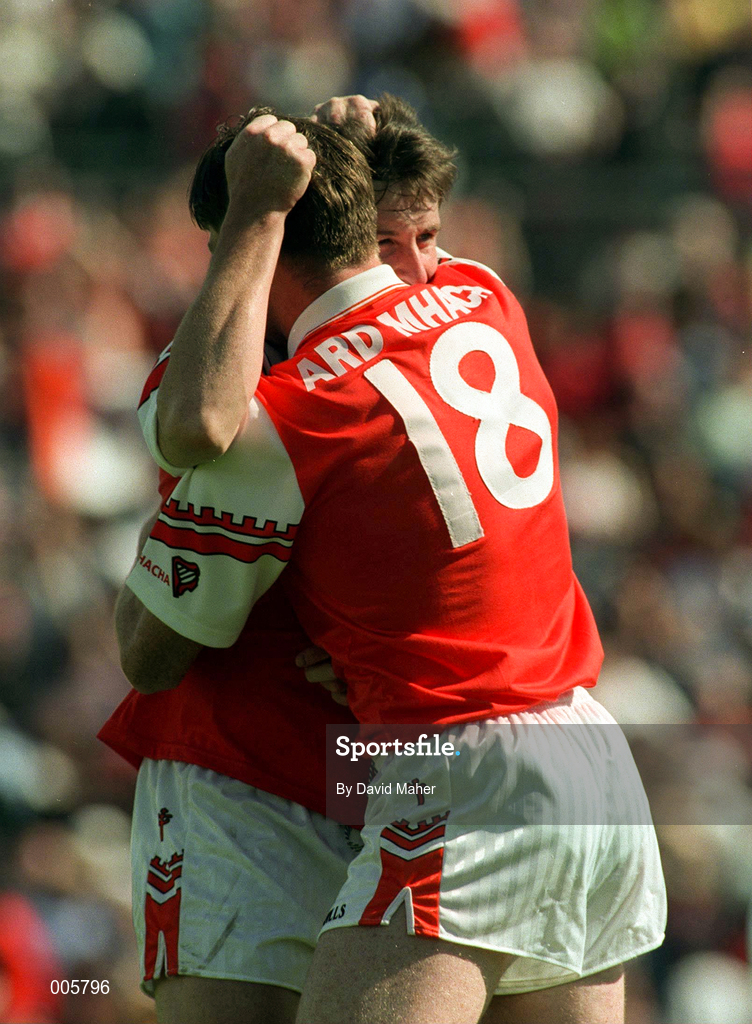14 June 1998; Ger Houlihan and Kieran Hughes of Armagh celebrate after the Ulster Senior Football Championship Quarter-Final match between Down and Armagh at St. Tiernach's Park, Clones. Photo by David Maher/Sportsfile