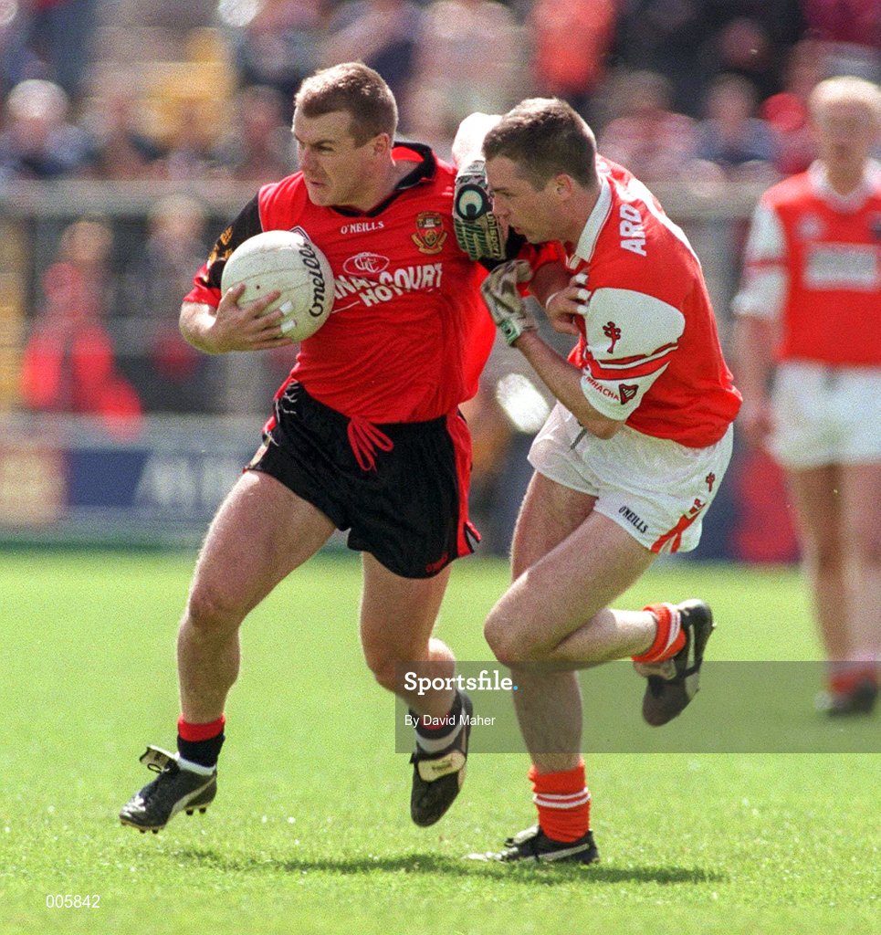 14 June 1998; James McCartan of Down in action against Andrew McCann of Armagh during the Ulster Senior Football Championship Quarter-Final match between Down and Armagh at St. Tiernach's Park, Clones. Photo by David Maher/Sportsfile