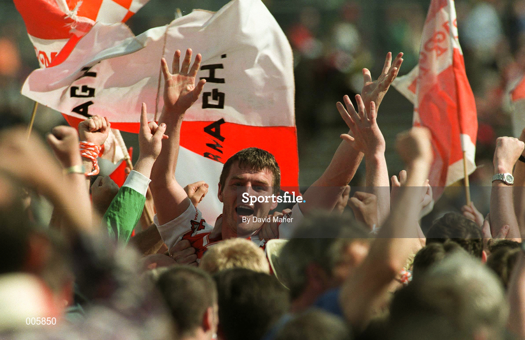 14 June 1998; Jarleth Burns of Armagh celebrates their victory at the final whistle during the Ulster Senior Football Championship Quarter-Final match between Down and Armagh at St. Tiernach's Park, Clones. Photo by David Maher/Sportsfile