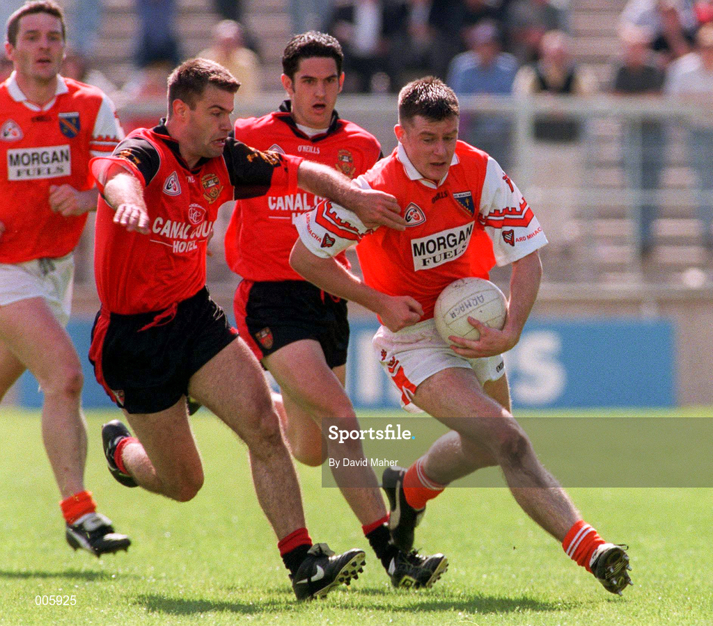 14 June 1998; Justin McNulty of Armagh in action against Finbar Caulfield of Down during the Ulster Senior Football Championship Quarter-Final match between Down and Armagh at St. Tiernach's Park, Clones. Photo by David Maher/Sportsfile