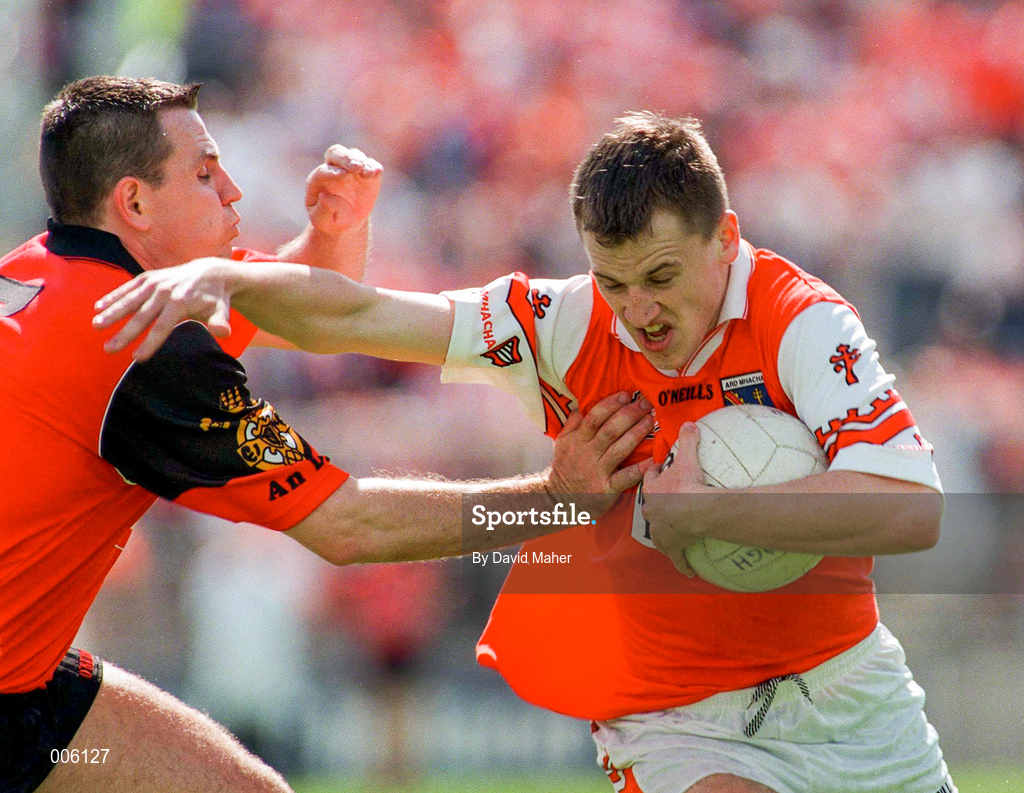 14 June 1998; Oisín McConville of Armagh in action against Michael Magill of Down during the Ulster Senior Football Championship Quarter-Final match between Down and Armagh at St. Tiernach's Park, Clones. Photo by David Maher/Sportsfile