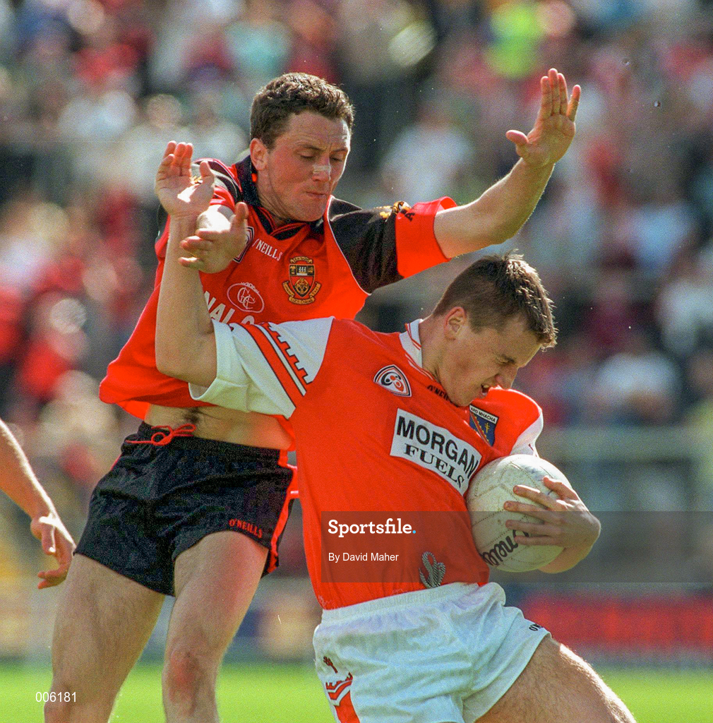 14 June 1998; Patrick McKeever of Armagh in action against Simon Poland of Down during the Ulster Senior Football Championship Quarter-Final match between Down and Armagh at St. Tiernach's Park, Clones. Photo by David Maher/Sportsfile