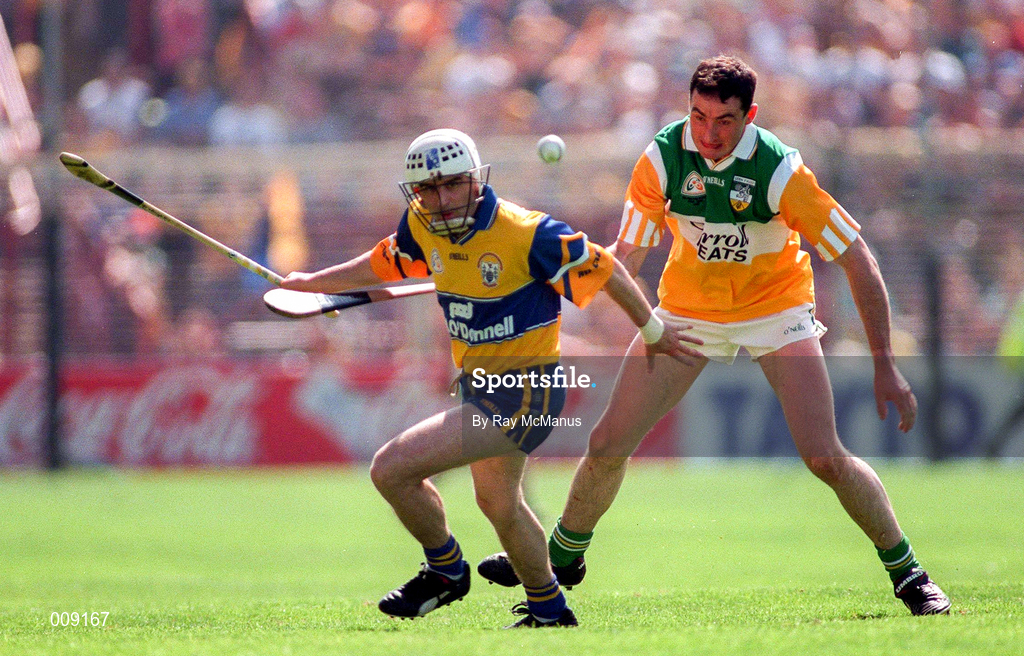 9 August 1998; Ger O'Loughlin of Clare in action against Kevin Kihahan of Offaly during the Guinness All-Ireland Senior Hurling Championship Semi-Final match between Clare and Offaly at Croke Park in Dublin. Photo by Ray McManus/Sportsfile