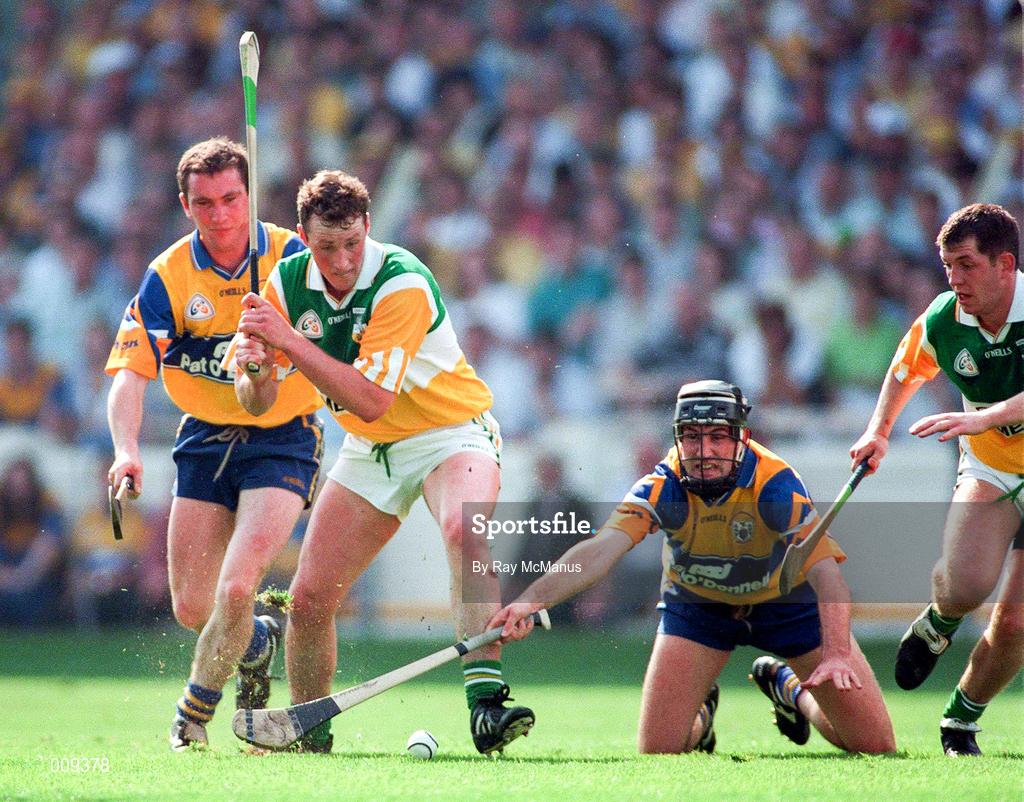 9 August 1998; John Ryan of Offaly in action against Brian Quinn, left, and Seánie McMahon of Clare during the Guinness All-Ireland Senior Hurling Championship Semi-Final match between Clare and Offaly at Croke Park in Dublin. Photo by Ray McManus/Sportsfile