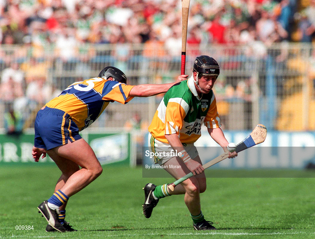 9 August 1998; John Troy of Offaly in action against Fergal Hegarty of Clare during the Guinness All-Ireland Senior Hurling Championship Semi-Final match between Clare and Offaly at Croke Park in Dublin. Photo by Brendan Moran/Sportsfile