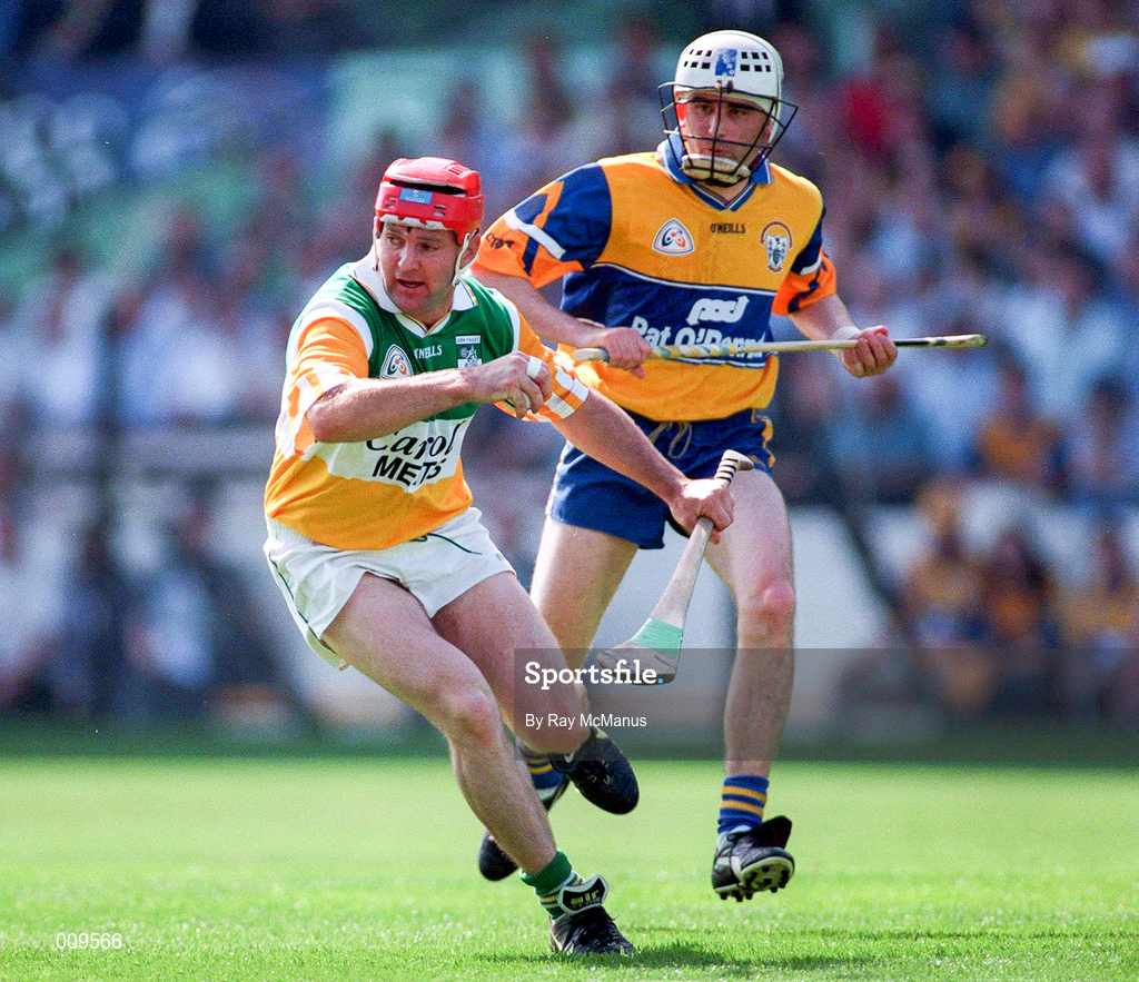 9 August 1998; Martin Hanamy of Offaly in action against Ger O'Loughlin of Clare during the Guinness All-Ireland Senior Hurling Championship Semi-Final match between Clare and Offaly at Croke Park in Dublin. Photo by Ray McManus/Sportsfile