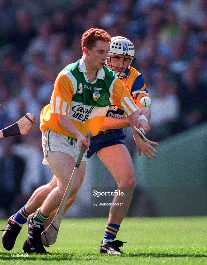 9 August 1998; Simon Whelahan of Offaly in action against Ger O'Loughlin of Clare during the Guinness All-Ireland Senior Hurling Championship Semi-Final match between Clare and Offaly at Croke Park in Dublin. Photo by Brendan Moran/Sportsfile