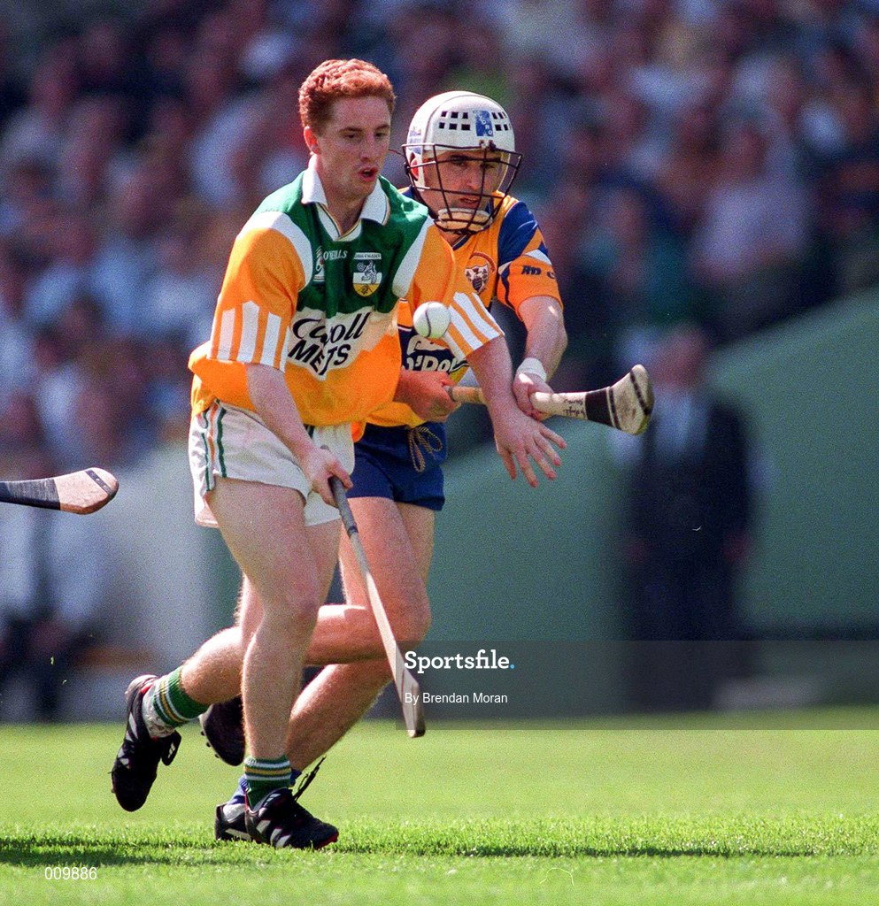9 August 1998; Simon Whelahan of Offaly in action against Ger O'Loughlin of Clare during the Guinness All-Ireland Senior Hurling Championship Semi-Final match between Clare and Offaly at Croke Park in Dublin. Photo by Brendan Moran/Sportsfile