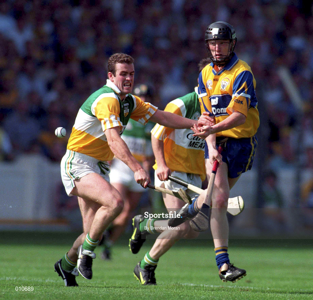 9 August 1998; Niall Gilligan of Clare is tackled by Kevin Martin of Offaly during the Guinness All-Ireland Senior Hurling Championship semi-final match between Offaly and Clare at Croke Park in Dublin. Photo by Brendan Moran/Sportsfile