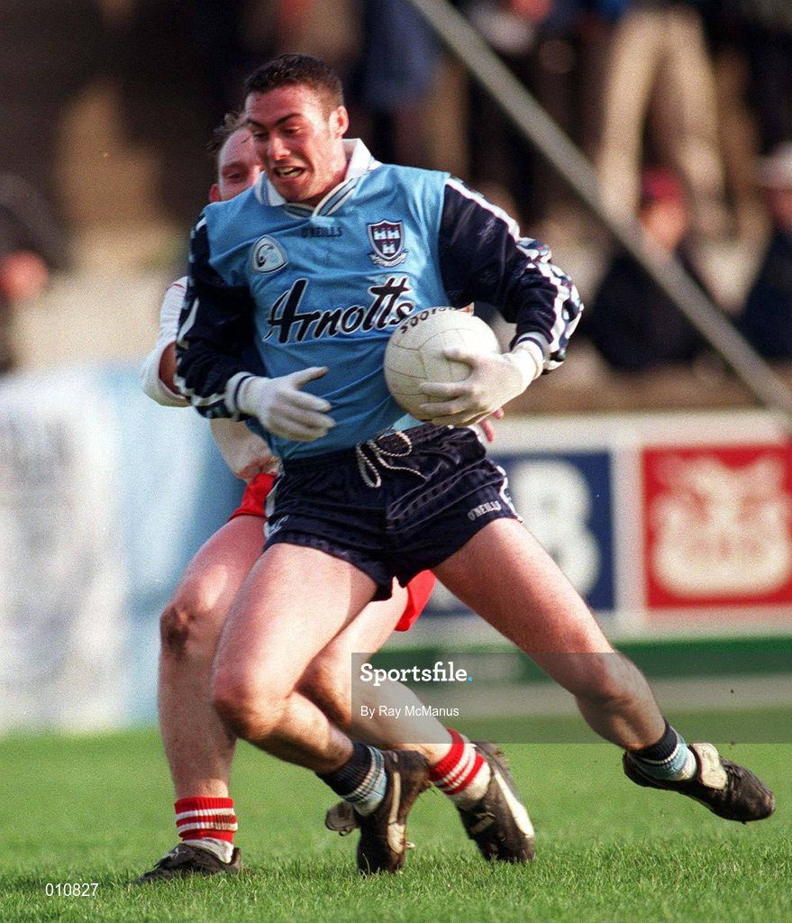 1 November 1998: Ray Cosgrove of Dublin in action against Fay Devlin of Tyrone during the Church & General National League Football match between Dublin and Tyrone at Parnell Park in Dublin. Photo by Ray McManus/Sportsfile