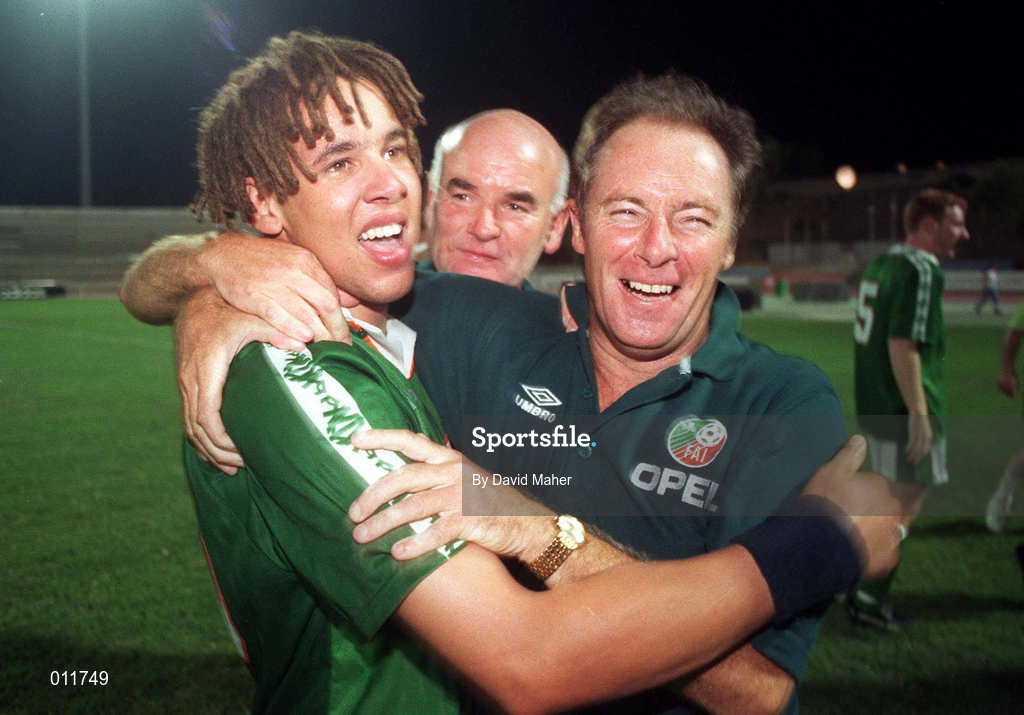 26 July 1998; Liam George of Republic of Ireland, with manager Brian Kerr, right, and assistant coach Noel O'Reilly, centre, celebrates following the UEFA European Under-18 Championship Final between Germany and Republic of Ireland at GSZ Stadium in Larnaca, Cyprus. Photo by David Maher/Sportsfile