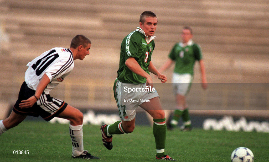 26 July 1998; Stephen McPhail of Republic of Ireland in action against Sebastian Deisler of Germany during the UEFA European Under-18 Championship Final between Germany and Republic of Ireland at GSZ Stadium in Larnaca, Cyprus. Photo by David Maher/Sportsfile