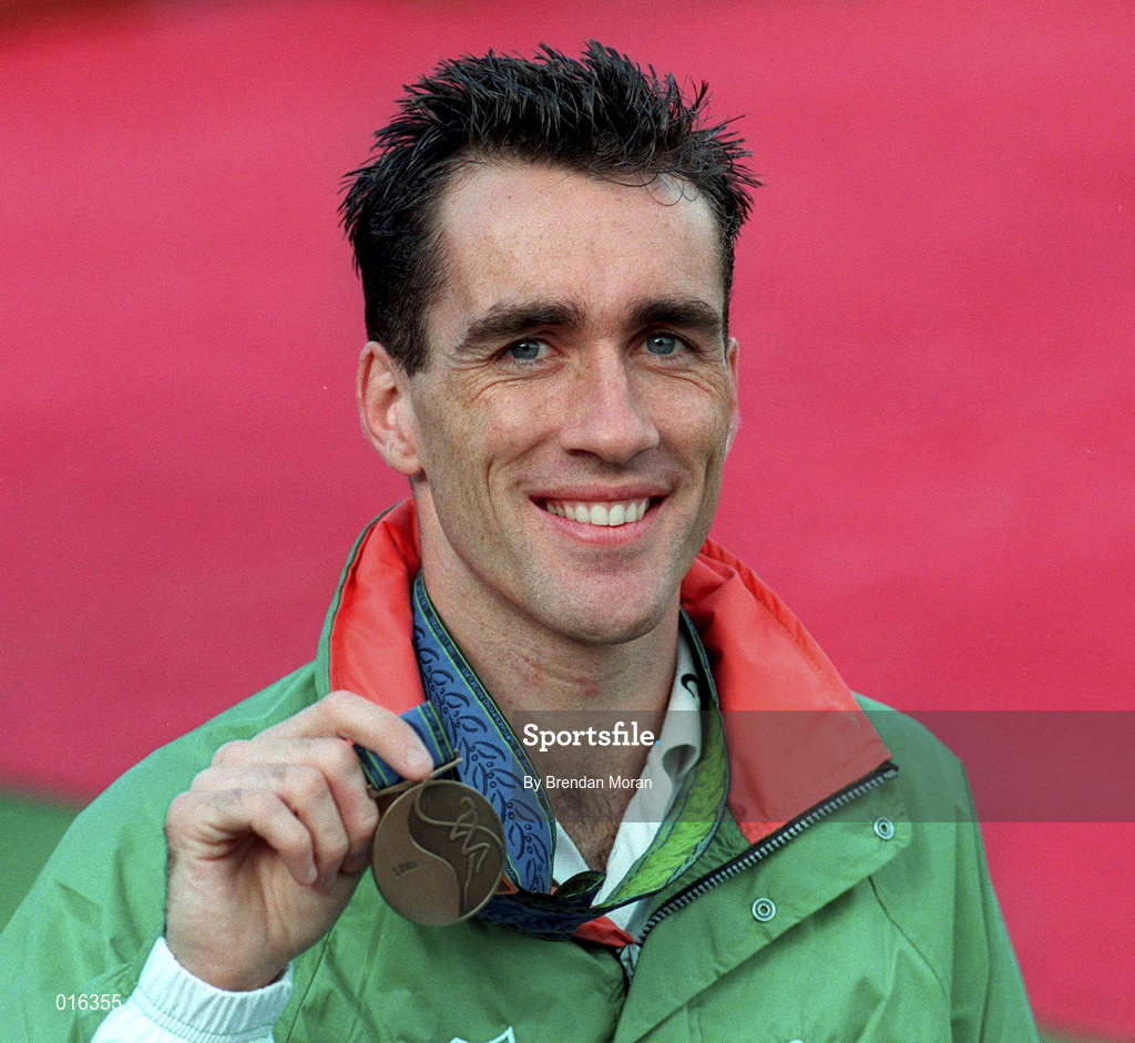 23 August 1998; Mark Carroll of Ireland with his bronze medal for the Men's 5000m during the European Athletics Championships at Nep Stadium in Budapest, Hungary. Photo by Brendan Moran/Sportsfile