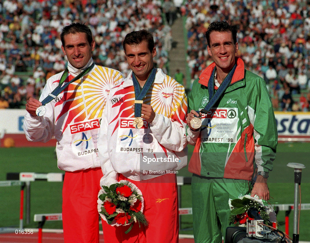 23 August 1998; Men's 5000m gold medallist Isaac Viciosa of Spain, centre, silver medallist Manuel Pancorbo of Spain, left, and bronze medallist Mark Carroll of Ireland during the European Athletics Championships at Nep Stadium in Budapest, Hungary. Photo by Brendan Moran/Sportsfile