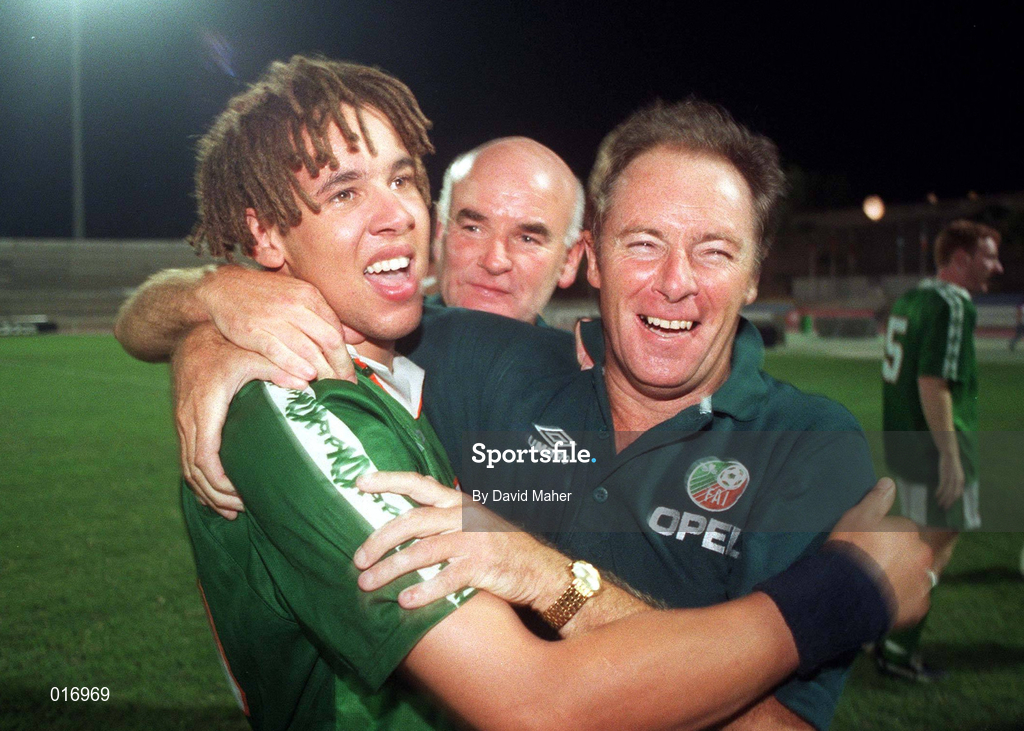 26 July 1998; Liam George of Republic of Ireland celebrates with Republic of Ireland manager Brian Kerr, right, and assistant coach Noel O'Reilly following the UEFA European Under-18 Championship Final between Germany and Republic of Ireland at GSZ Stadium in Larnaca, Cyprus. Photo by David Maher/Sportsfile.