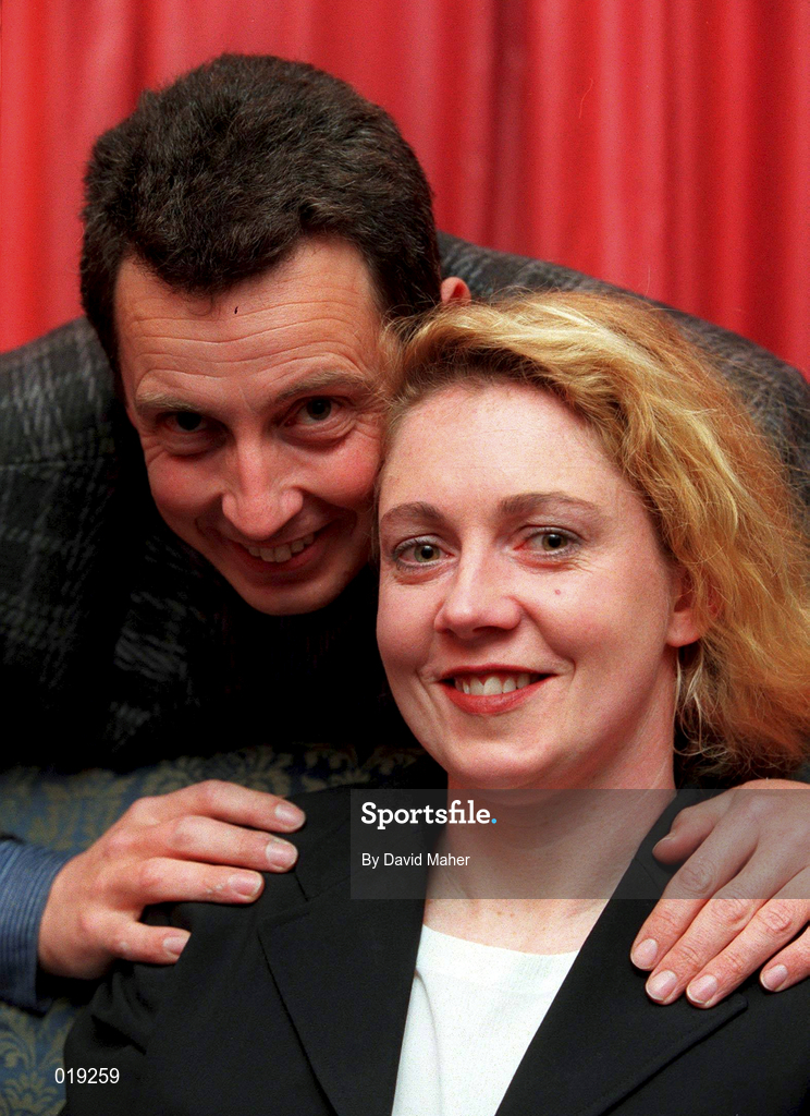 11 February 1999; Irish swimmer Michelle Smith de Bruin and husband Eric pose for a portrait at Jury's Hotel in Dublin. Photo by David Maher/Sportsfile