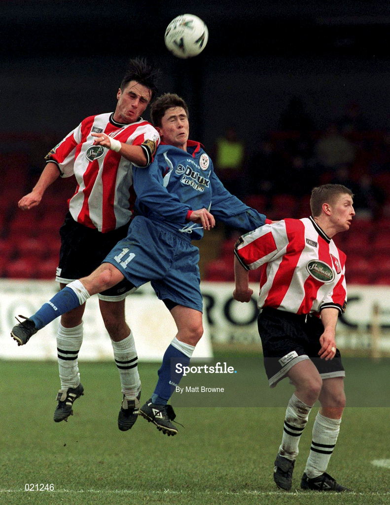 7 March 1999; Gary Beckett of Derry City in action against Richie Baker of Shelbourne during the FAI Cup quarter-final match between Derry City and Shelbourne at The Brandywell Stadium in Derry. Photo by Matt Browne/Sportsfile