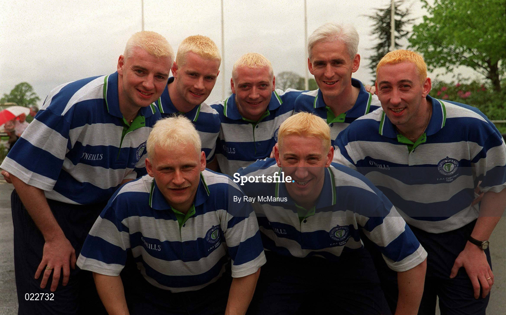 8 May 1999; Members of the Finn Harps team, including Gavin Dykes, Jonathan Minnock, James Mulligan, Michael McGeehin, coach Damien Bradley, Shane Bradley and Jonathan Speake who dyed their hair blonde ahead of the Harp Lager FAI Cup final match between Bray Wanderers and Finn Harps at Tolka Park in Dublin. Photo by Ray McManus/Sportsfile