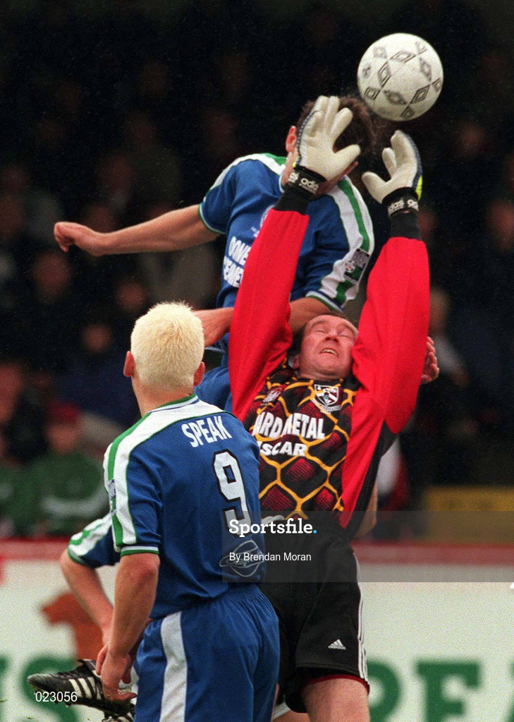 9 May 1999; Declan Boyle of Finn Harps in action against John Walsh of Bray Wanderers as Jonathan Speak of Finn Harps looks on during the Harp Lager FAI Cup final match between Bray Wanderers and Finn Harps at Tolka Park in Dublin. Photo By Brendan Moran/Sportsfile