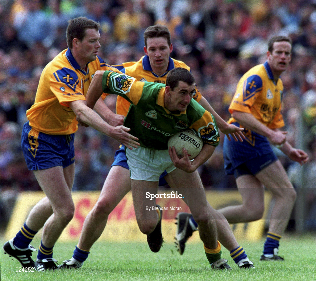 30 May 1999; Christopher Carroll of Leitrim in action against Derek Duggan, left, and Clifford McDonald of Roscommon during the Bank of Ireland Connacht Senior Football Championship quarter-final match between Leitrim and Roscommon at Páirc Seán Mac Diarmada in Carrick-on-Shannon, Leitrim. Photo by Brendan Moran/Sportsfile
