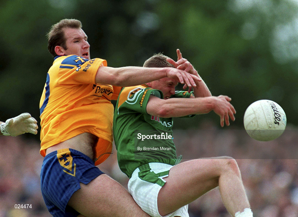 30 May 1999; Fergal O'Donnell of Roscommon in action against Brendan Guckian of Leitrim during the Bank of Ireland Connacht Senior Football Championship quarter-final match between Leitrim and Roscommon at Páirc Seán Mac Diarmada in Carrick-on-Shannon, Leitrim. Photo by Brendan Moran/Sportsfile