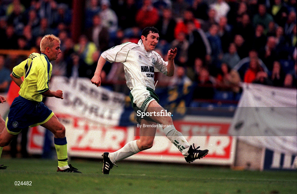 20 May 1999; Jason Byrne of Bray Wanderers shoots to score his side's second and winning goal during the FAI Cup Final Second Replay match between Finn Harps and Bray Wanderers at Tolka Park in Dublin. Photo by Brendan Moran/Sportsfile