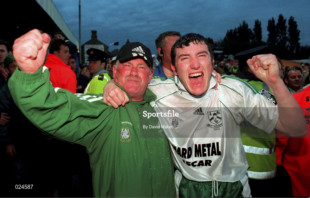 20 May 1999; Bray Wanderers manager Pat Devlin, left, and goalscorer Jason Byrne celebrate following the FAI Cup Final Second Replay match between Finn Harps and Bray Wanderers at Tolka Park in Dublin. Photo by David Maher/Sportsfile