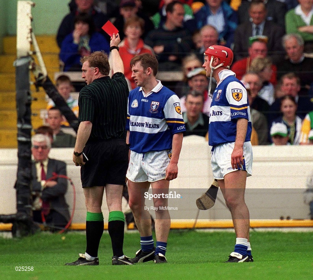 20 June 1999; Cyril Cuddy of Laois is shown a red card by referee Michael Wadding during the Guinness Leinster Senior Hurling Championship Semi-Final match between Kilkenny and Laois at Croke Park in Dublin. Photo by Ray McManus/Sportsfile