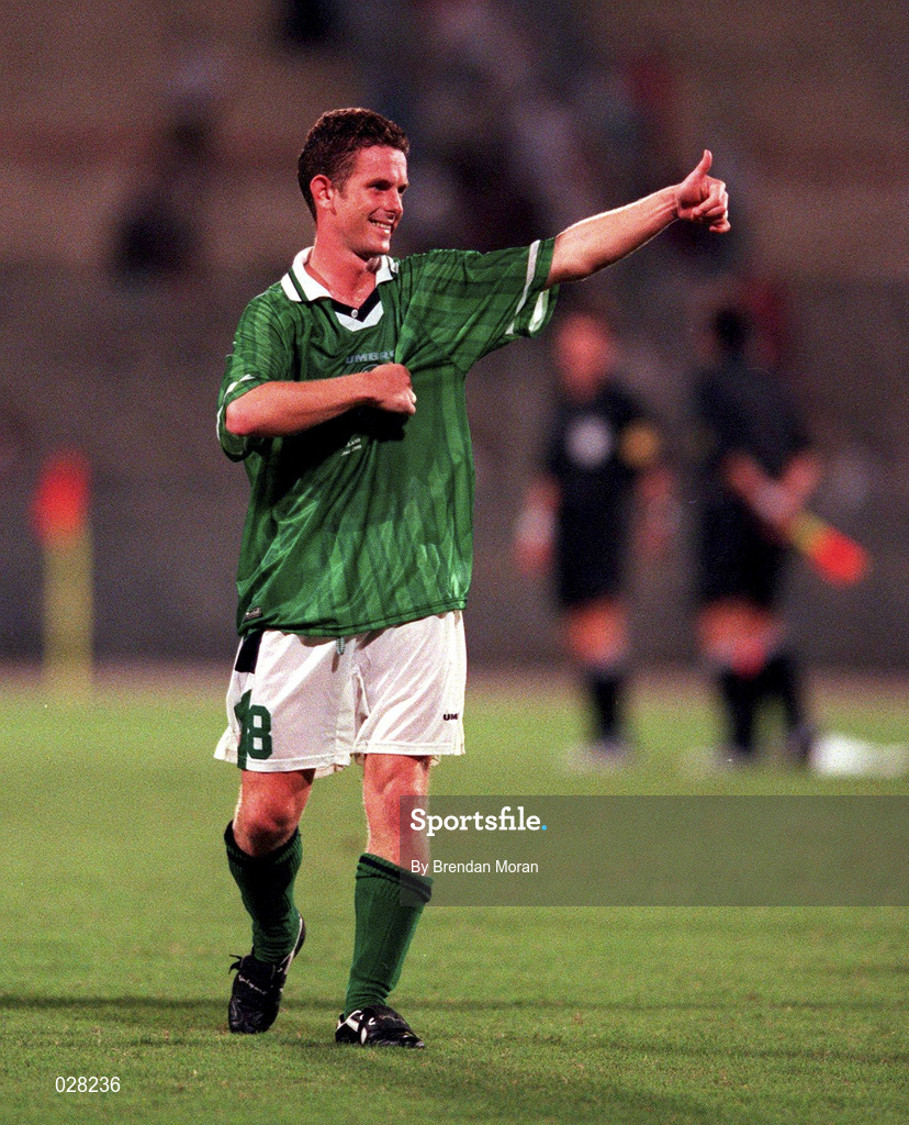 8 September 1999; Republic of Ireland's Mark Kinsella acknowledges the travelling supporters following the UEFA European Championships Qualifier Group 8 match between Malta and Republic of Ireland at Ta'Qali Stadium in Attard, Malta. Photo by Brendan Moran/Sportsfile