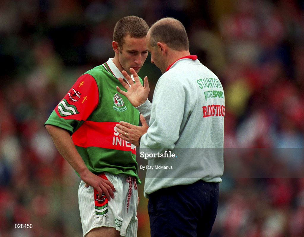 22 August 1999; Mayo's Paraic Kelly receives some instructions during the All-Ireland Minor Football Championship Semi-Final match between Cork and Mayo at Croke Park in Dublin. Photo by Ray McManus/Sportsfile