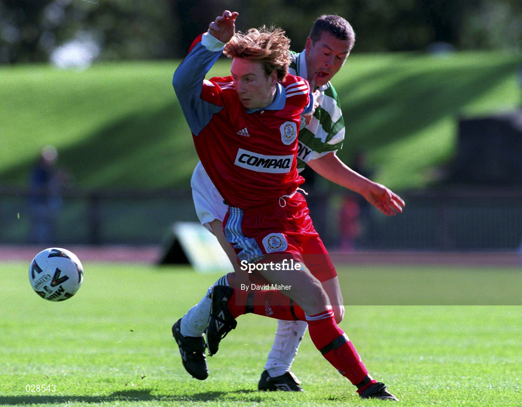 3 October 1999; Adrian Cregg of Galway in action against Thomas Dunne of Shamrock Rovers during the Eircom League Premier Division match between Shamrock Rovers and Galway United at Morton Stadium in Santry, Dublin. Photo by David Maher/Sportsfile