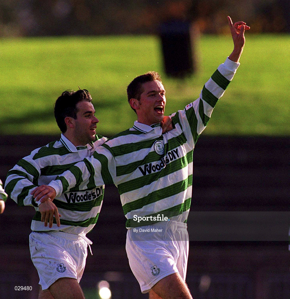 7 November 1999; Billy Woods celebtates with his Shamrock Rovers team-mate Jason Colwell, left, after scoring his sides first goal during the Eircom League Premier Division match between Shamrock Rovers and Drogheda United at Morton Stadium in Santry, Dublin. Photo by David Maher/Sportsfile