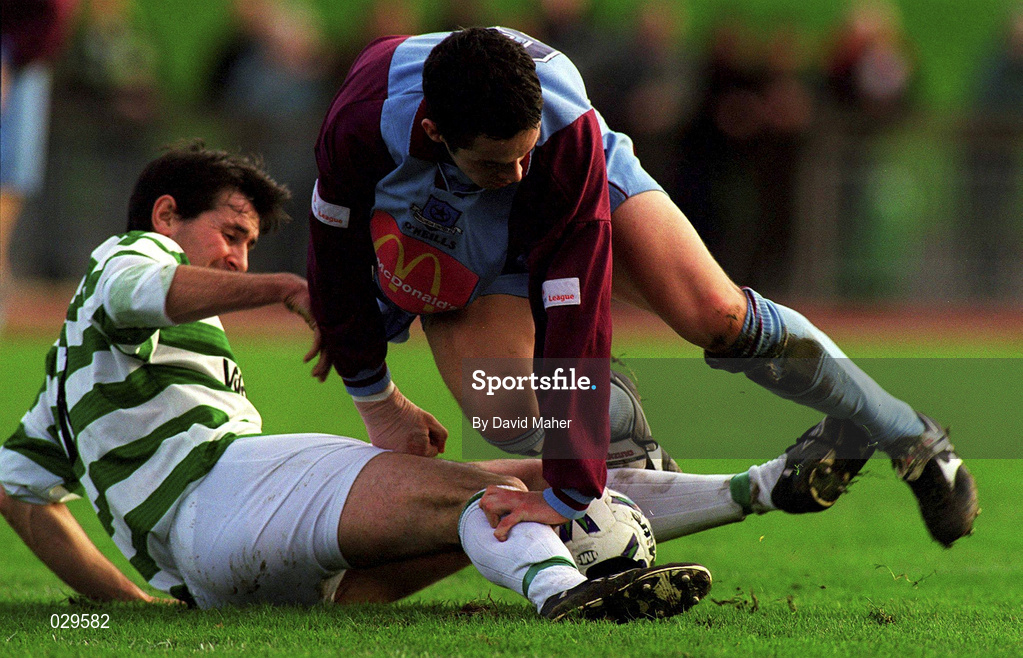 7 November 1999; Brian Byrne of Shamrock Rovers in action against Darren O'Keefe of Drogheda United during the Eircom League Premier Division match between Shamrock Rovers and Drogheda United at Morton Stadium in Santry, Dublin. Photo by David Maher/Sportsfile