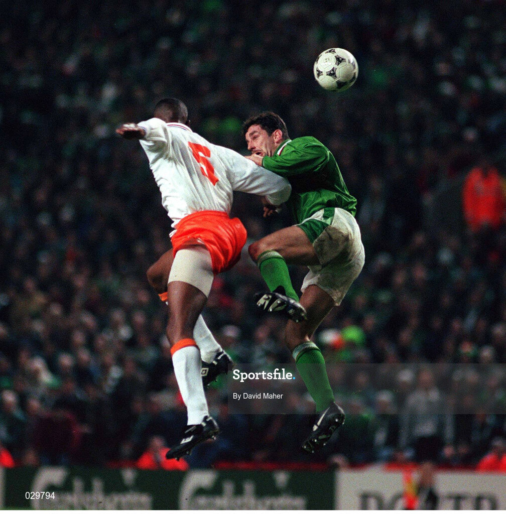 13 December 1995; Republic of Ireland's John Aldridge in action against Winston Bogarde, Netherlands. European Soccer Championship Qualifying Play-off, Anfield, Liverpool, England. Photo by David Maher/Sportsfile