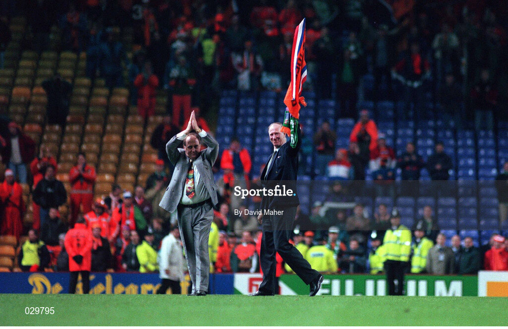 13 December 1995; Republic of Ireland manager Jack Charlton, right, and assistant Maurice Setters applaud the crowd after their side were defeated by Netherlands. European Soccer Championship Qualifying Play-off, Anfield, Liverpool, England. Photo by David Maher/Sportsfile