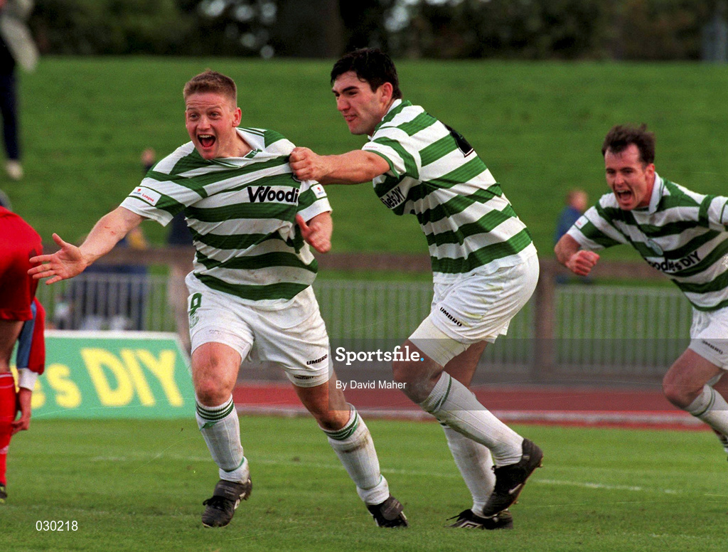 3 October 1999; Richie Purdy, left, celebrates with his Shamrock Rovers team-mates Sean Jackson and Derek Tracey, right, after scoring his side's 92th minute winning goal during the Eircom League Premier Division match between Shamrock Rovers and Galway United at Morton Stadium in Santry, Dublin. Photo by David Maher/Sportsfile