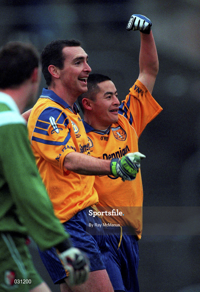 5 December 1999; Aaron Shearer of Na Fianna celebrates his late goal with team-mate Jason Sherlock, right, in the AIB Leinster Senior Club Football Championship Final match between Na Fianna and Sarsfields at Páirc Tailteann in Navan, Meath. Photo by Ray McManus/Sportsfile