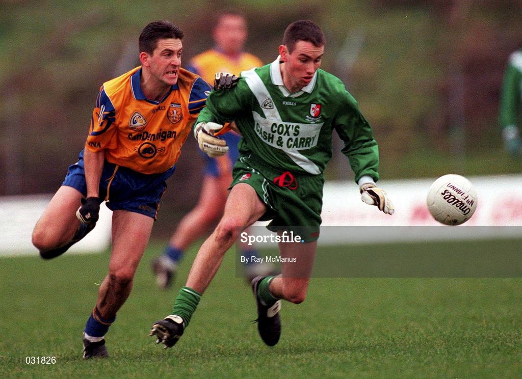 5 December 1999; Pauric Brennan of Sarsfields in action against Senan Connell of Na Fianna during the AIB Leinster Senior Club Football Championship Final match between Na Fianna and Sarsfields at Páirc Tailteann in Navan, Meath. Photo by Ray McManus/Sportsfile